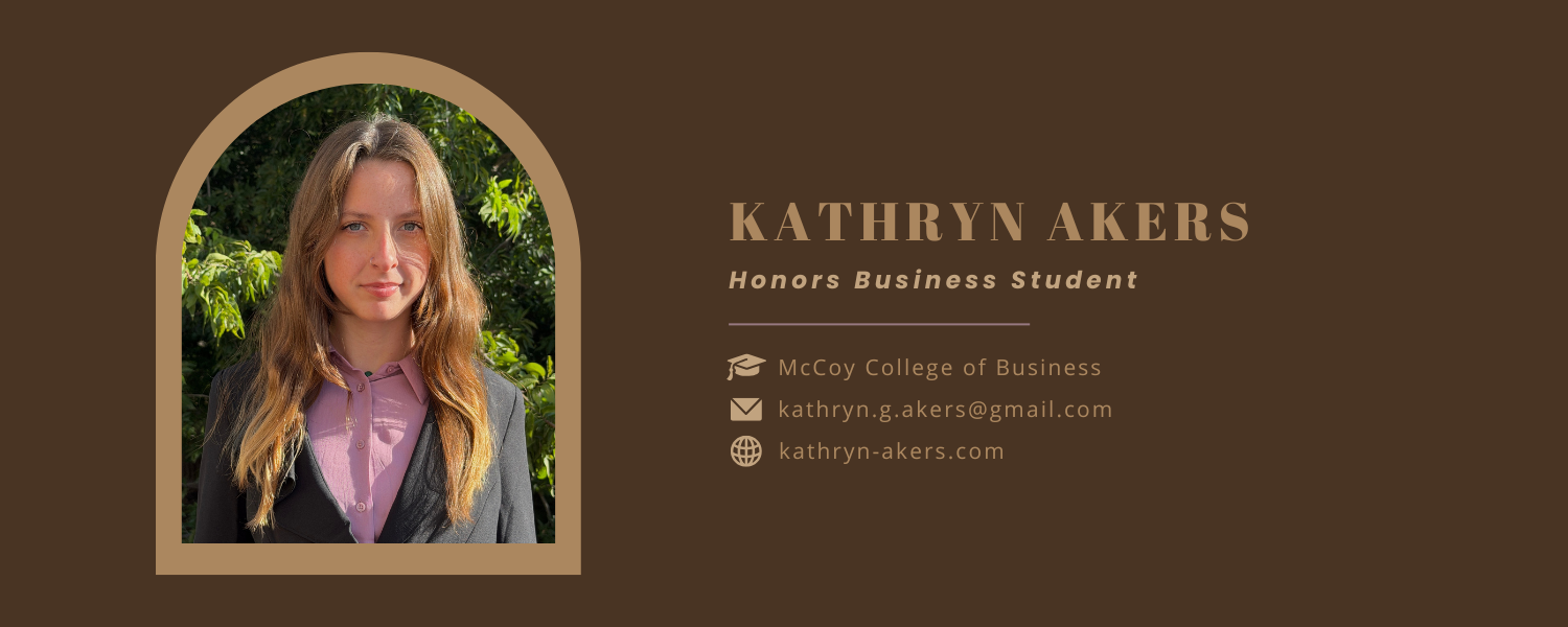 I’m Kathryn Akers, an Honors student at the Texas State McCoy College of Business majoring in Marketing and minoring in Journalism. My expected graduation date is May 2028, and I am located in Austin, Texas.